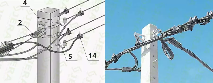 optic ADSS cables at intermediate poles on straight routes. Mostly installed in LV-ABC line with anchor clamps for main cables by 2 stainless steel band (20 mm) or 1 bolts 14, 16 mm diameter.