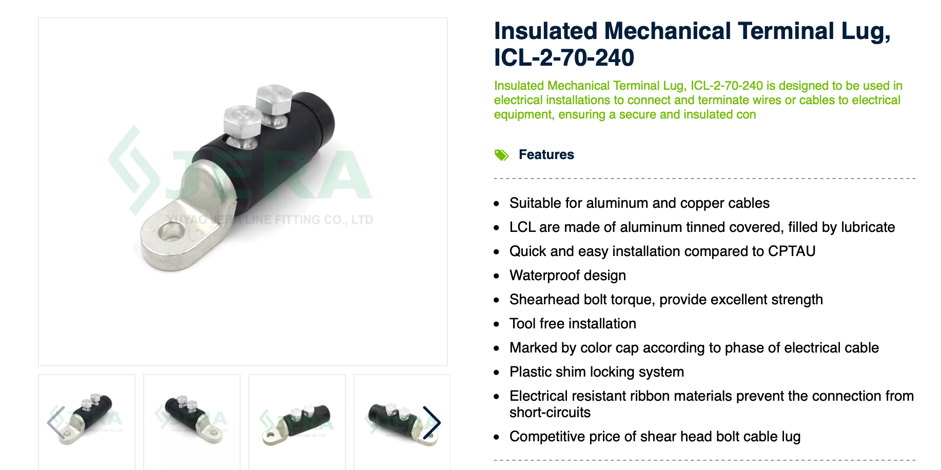 Jera line produce ICL-2-70-240 comply to IEC-61238-1-3, three zones of torque shear bolts,applied with copper and aluminum.