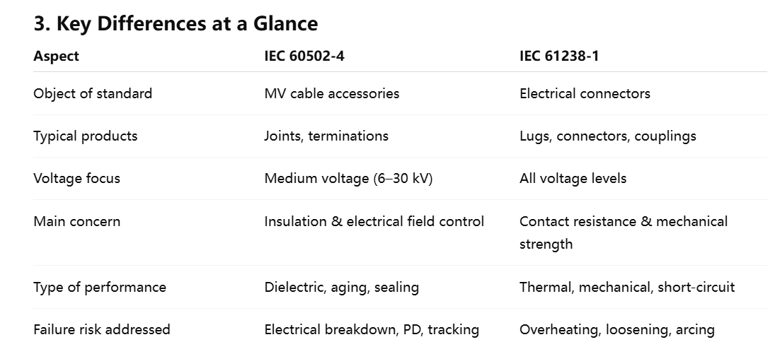 Although both IEC 60502-4 and IEC 61238-1 are international standards related to power cable systems, they cover different product scopes and different technical requirements.