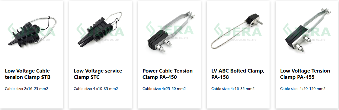 To keep overhead four-core cables securely in place, Jera Line offers a range of suspension and tension clamps:
