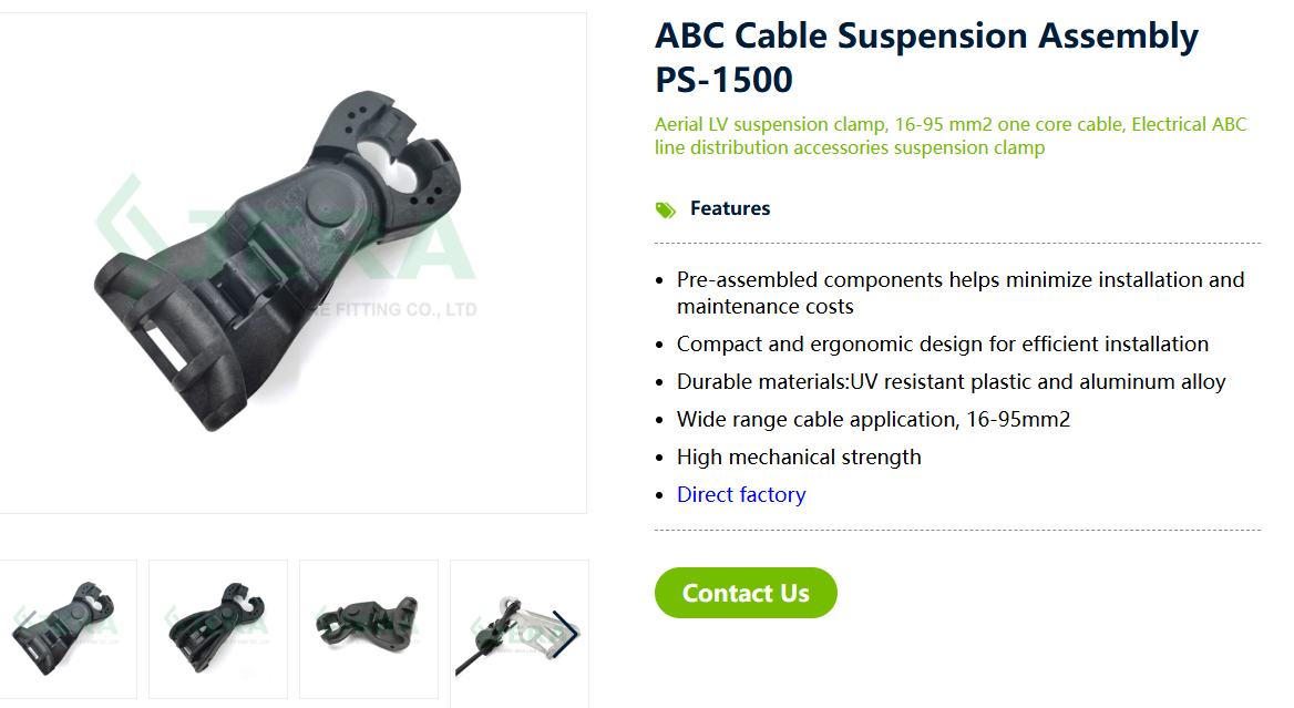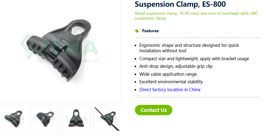 For low-voltage ABC cables in IMWS, SO69.95 and ES-800 suspension clamps are versatile solution. It attaches low-voltage ABC cables (with insulated neutral messengers) to towers, poles, or walls, handling angles up to 30° toward the pole and 50° away. A direct factory product, the ES-800 balances quality and affordability for small-to-large scale projects.