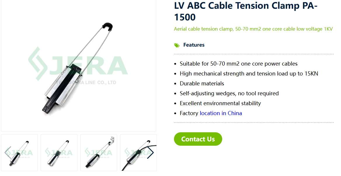 Tension points—like line terminations and corners—demand specialized hardware, SO250 and the PA-1500 tension clamps rise to the challenge. Following Jera Line’s tension clamp legacy (exemplified by the PA-450 ), the PA-1500 features corrosion-resistant aluminum or stainless steel construction to withstand mechanical stress. It secures IMWS cables in high-tension spans, maintaining alignment and preventing insulation damage. Ideal for long-distance distribution lines, SO250 and PA-1500 clamps ensure consistent performance in extreme environments.