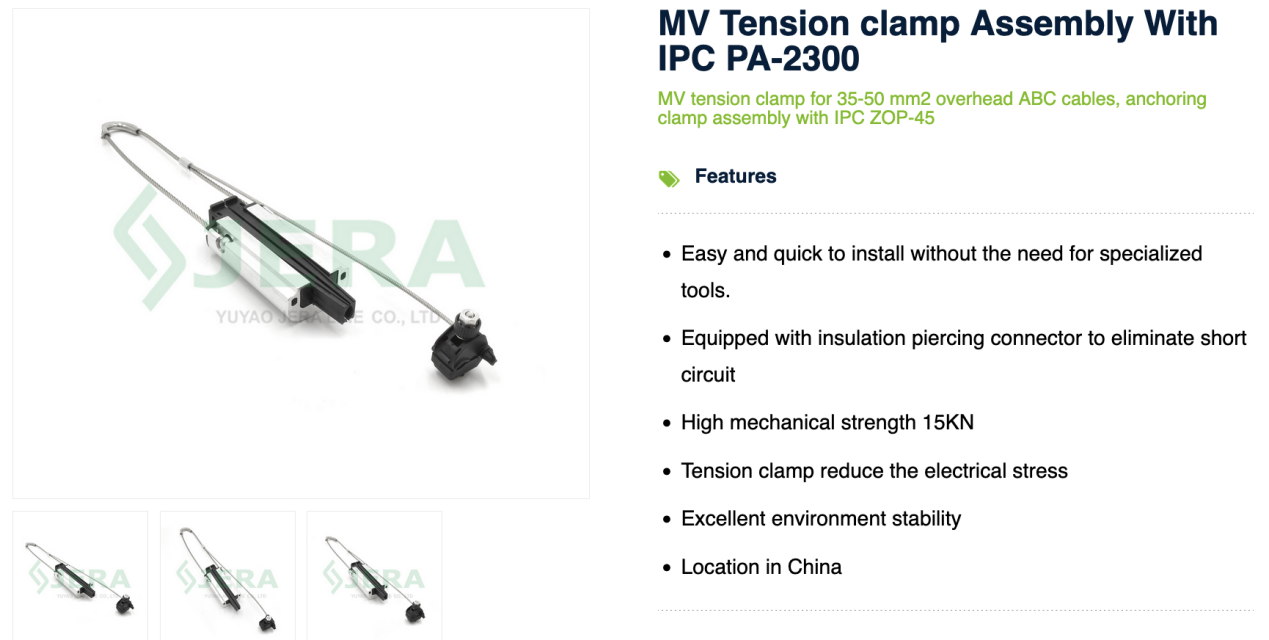 If your project specifications reference MV ABC cable clamp PA-1500 RPI or DN-70 RPI, you can confidently consider the Jera Line tension clamp PA-2300 with IPC for MV cables as a compatible analog.