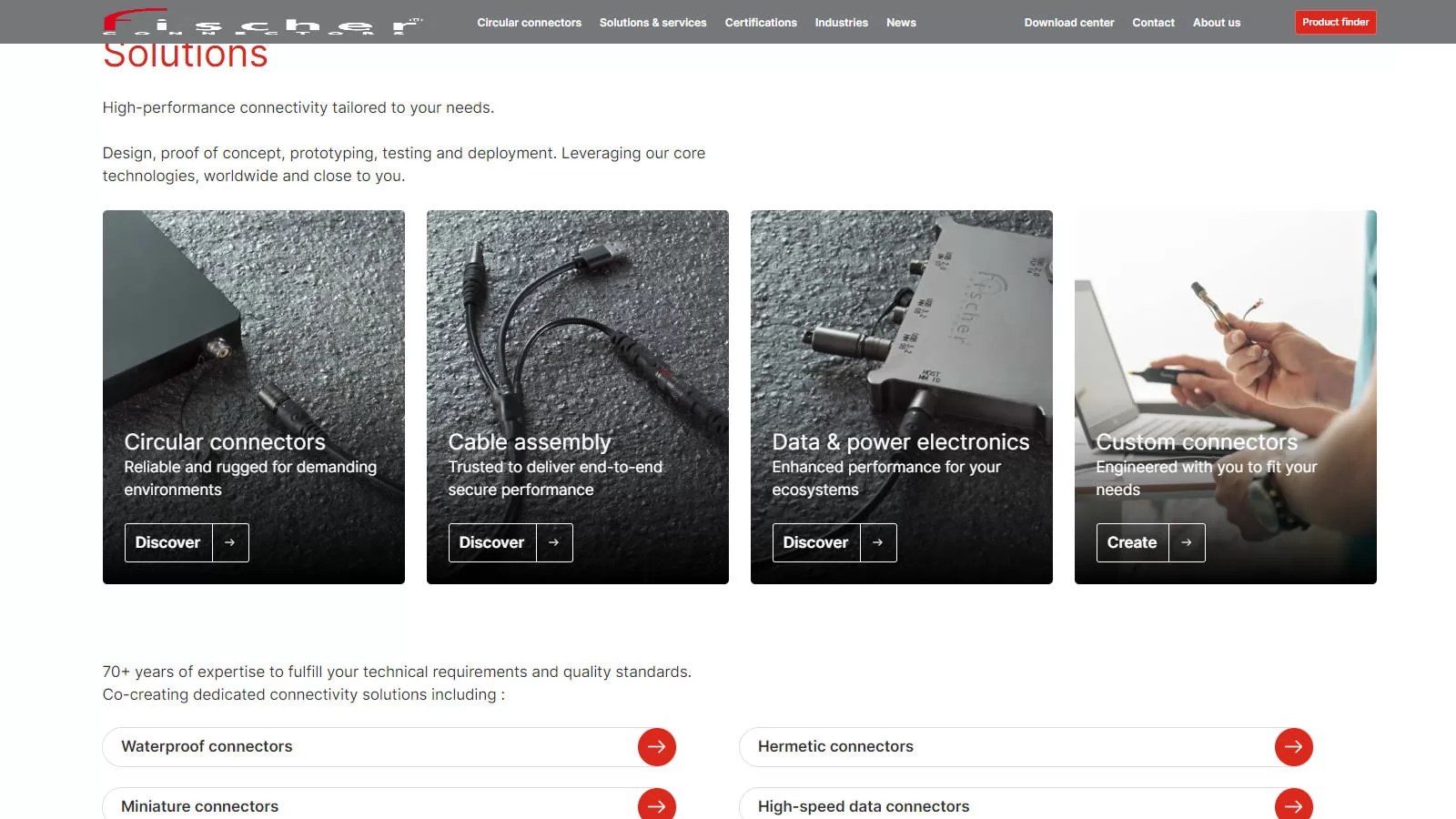 Since our company founder developed the world’s first high-quality sealed circular connector, our Swiss-headquartered company has grown from a provider of connectors to a full-service partner in connectivity. Today, Fischer Connectors is part of the global technology group Conextivity, offering high-performance connectivity solutions that manage power and data flows seamlessly from sensors and devices to the cloud and AI, enabling the emergence of new ecosystems. With nearly 600 people worldwide, four R&D centers and six manufacturing sites, the group comprises two core businesses: Fischer Connectors and Wearin’.