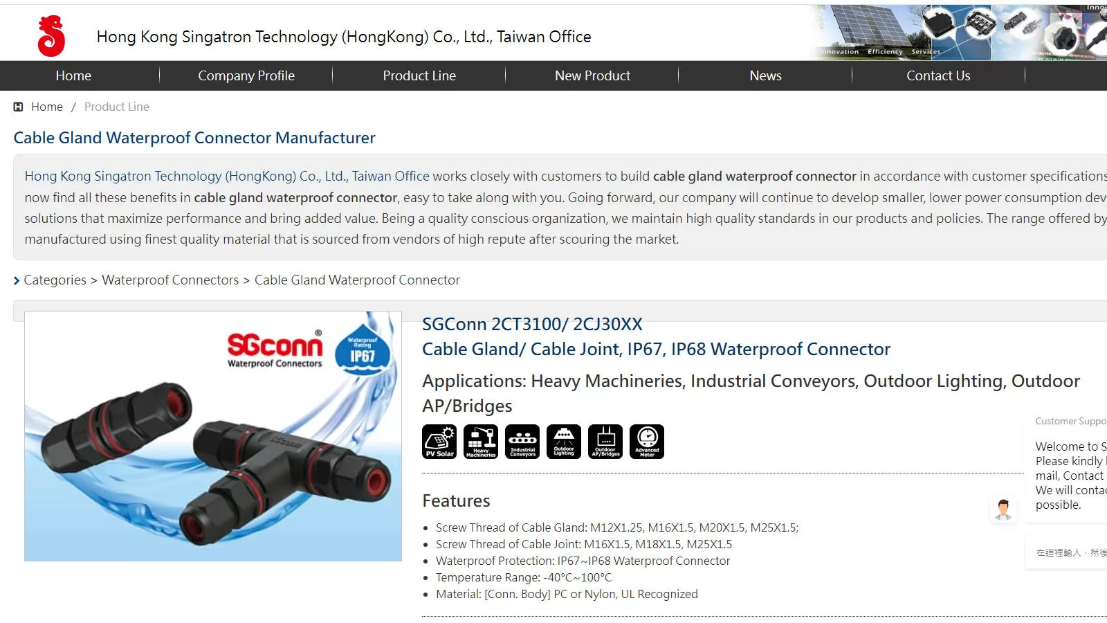 Singleton Group was first established in Hsinchu, Taiwan in 1976. Since 2000, Singatron established China plants in both Suzhou and Zhongshan to satisfy customers' demands in the China area. In 2012, Singatron introduced IP65~68 waterproof connectors ⌈SGConn®⌋ into the market. Application segments served include marine electronics, outdoor displays, outdoor lighting, outdoor communications, industrial automation, and light electronic vehicles. Singatron works with its customers and focuses on innovation, and development to provide high-quality connectors, professional support, and competitive pricing to the global electronics industries. Singatron not only has established facilities in the Greater China Area but also provides a worldwide service network in Taiwan, China, South Korea, the USA, Canada, and Europe.
