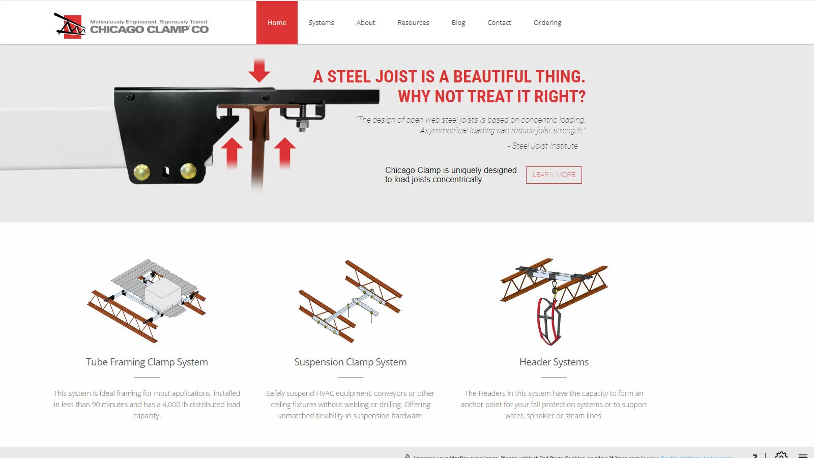 Company Profile: Utilizing over 40 years of engineering experience, Chicago Clamp Company was founded with the mission to create a new, safe, structurally reliable, and economical standard for framing roof openings and supporting and distributing loads from joists. For decades, contractors have used traditional welding and cut-angle methods. These methods require certified welding which can be expensive, complicated, and hazardous; if done incorrectly it can compromise the integrity of the joist. To eliminate these inherent project risks, Chicago Clamp Company has developed three easy-to-install Clamp Systems.