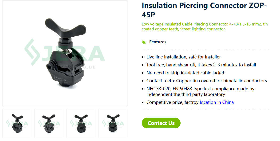 ZOP-45P insulation piercing connector is one of the IPC model from Jera Line, it can be the analogs of TTD EP IPC, suitable for LV overhead cable connections.