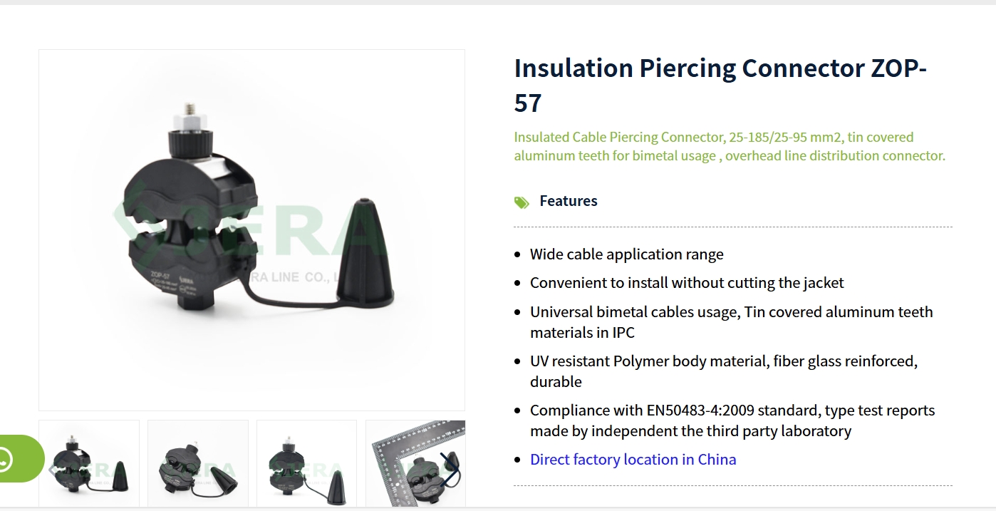 Jera line is a leading manufacturer in China who specialized in producing low and medium voltage insulation piercing connectors, the model ZOP-57( 25-185/25-95mm2) which meets the specification of TDR 95/95 perforation isolant.