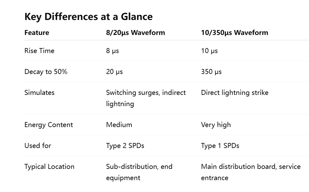 When it comes to surge protection and lightning current testing, you’ll often see terms like 10/350 μs and 8/20 μs used to describe current waveforms. These numbers are not random,they represent standardized test waveforms defined in IEC standards to simulate real-world lightning and surge conditions. But what exactly do they mean and what’s the difference between them? Let’s break it down.