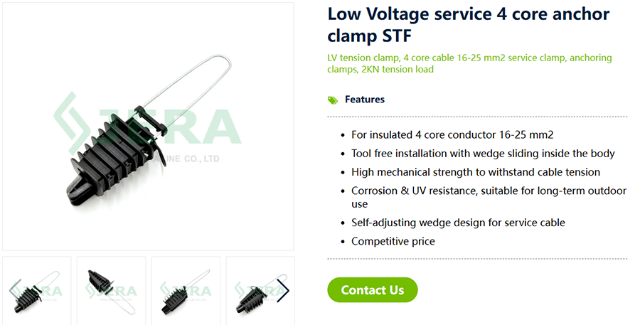 The primary use of the Pinza de amarre STF, tension clamp STF is to terminate 2-conductor or 4-conductor low-voltage ABC service lines—the cables that distribute electricity from utility poles to residential, commercial, or small industrial buildings.